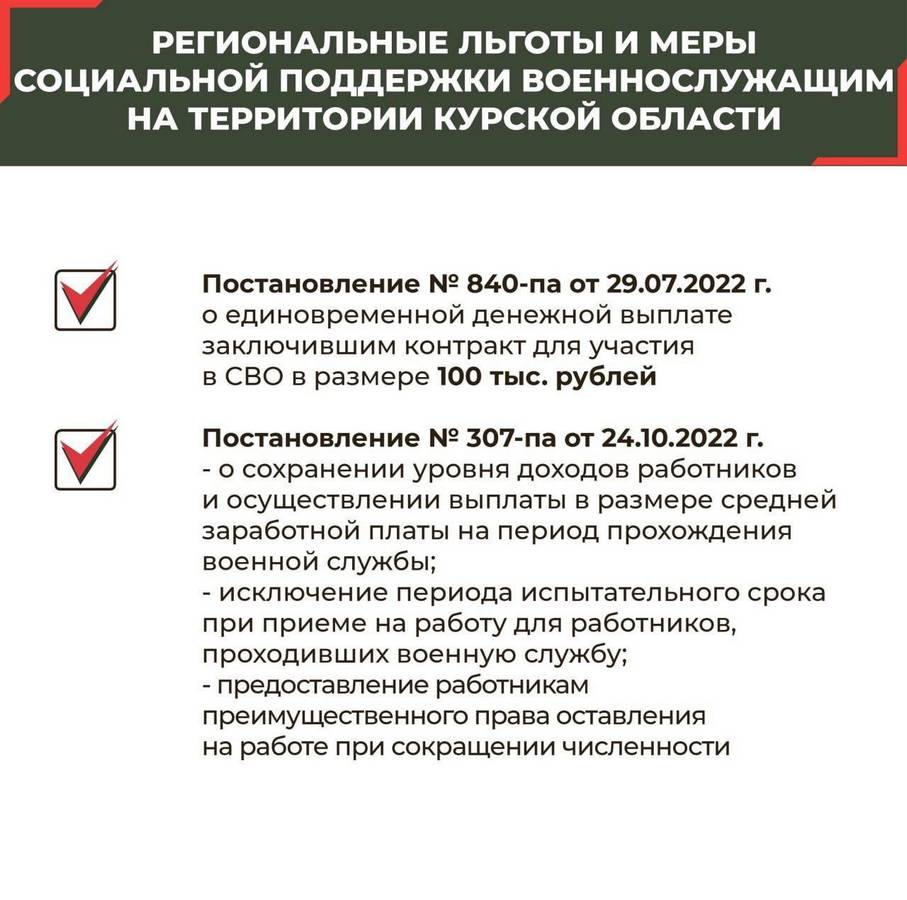 В Курской области продолжается отбор на военную службу по контракту. В карточках подробная информация о том, какие требования предъявляют к кандидатам, какие выплаты и льготы получают контрактники и куда нужно обратиться для подачи заявления.